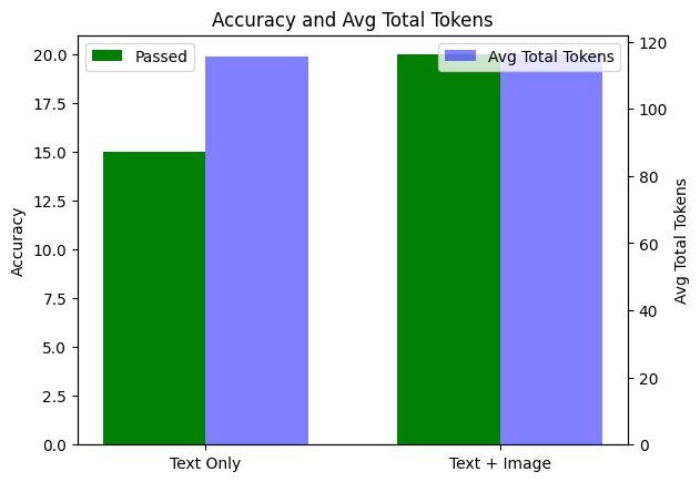 We can retrieve the results of these evaluation runs and perform some local analysis. In this case, we will compare the performance of the text-only and text+image runs and evaluate how increasing the number of total tokens (through the addition of image context) affects the accuracy of the model. We can also do some basic error analysis by analysing the model input of the failed examples.
